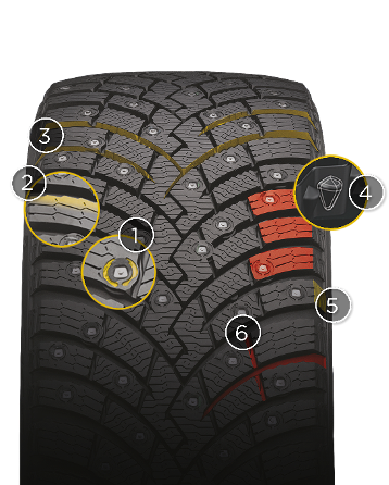 Решающую роль при передаче сцепления шины с дорогой играет конструкция лунки для шипа в протекторе. А оптимизированная жесткость резиновой смеси в области шипа усиливает его крепление.
